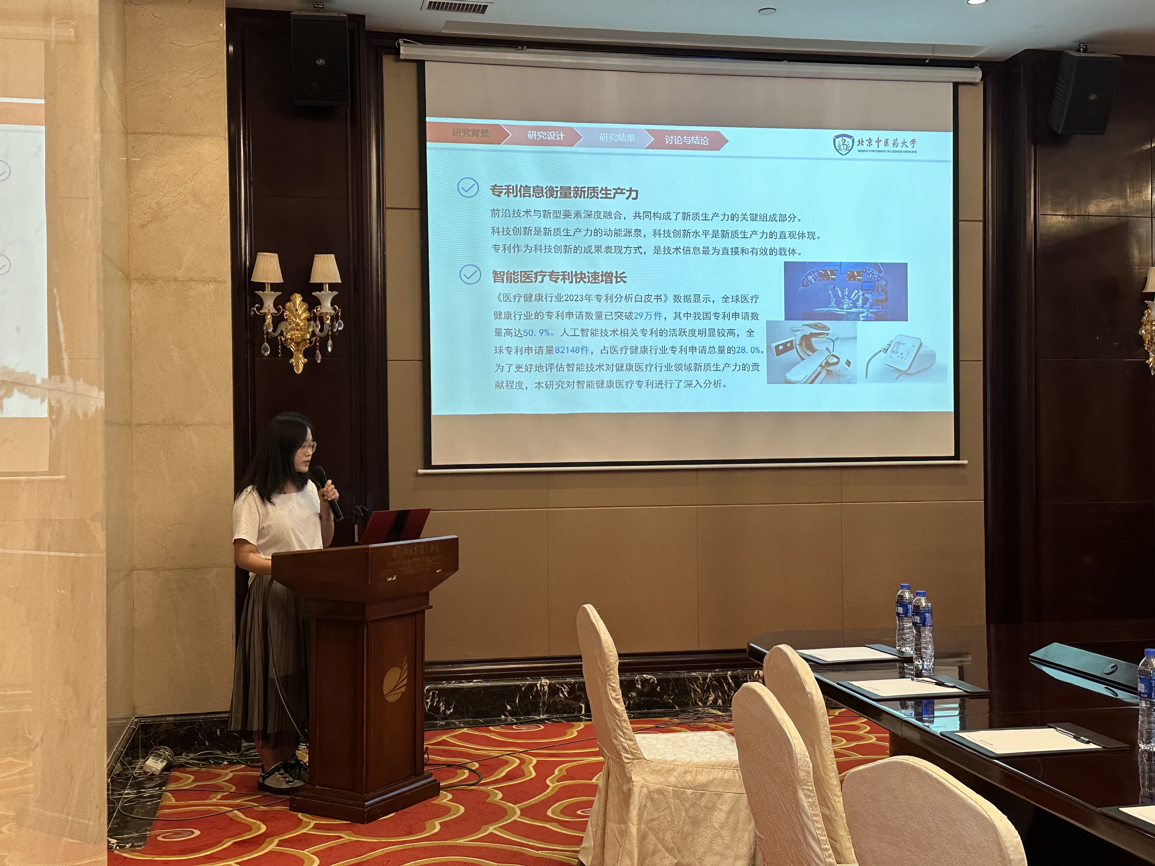 杨惠雯同学做了《新质生产力视角下中国智能健康医疗专利的创新态势研究》的报告,该研究为了更好地评估智能技术对健康医疗行业领域新质生产力的贡献程度,对智能健康医疗专利进行了深入分析:首先于国家知识产权局专利检索及分析系统中获取智能健康医疗类专利数据,其次对中国智能健康医疗专利的专利数量、申请人等外部信息进行了统计分析,然后分析了领域内技术、主题热点及发展趋势,并指出以人工智能为代表的健康医疗领域新质生产力正在逐步形成并加速发展,未来智能健康医疗产业的发展可从政策导向、科研投入、人才储备等多个维度进行综合推动,以实现健康医疗领域生产力的进一步革新与升级。
