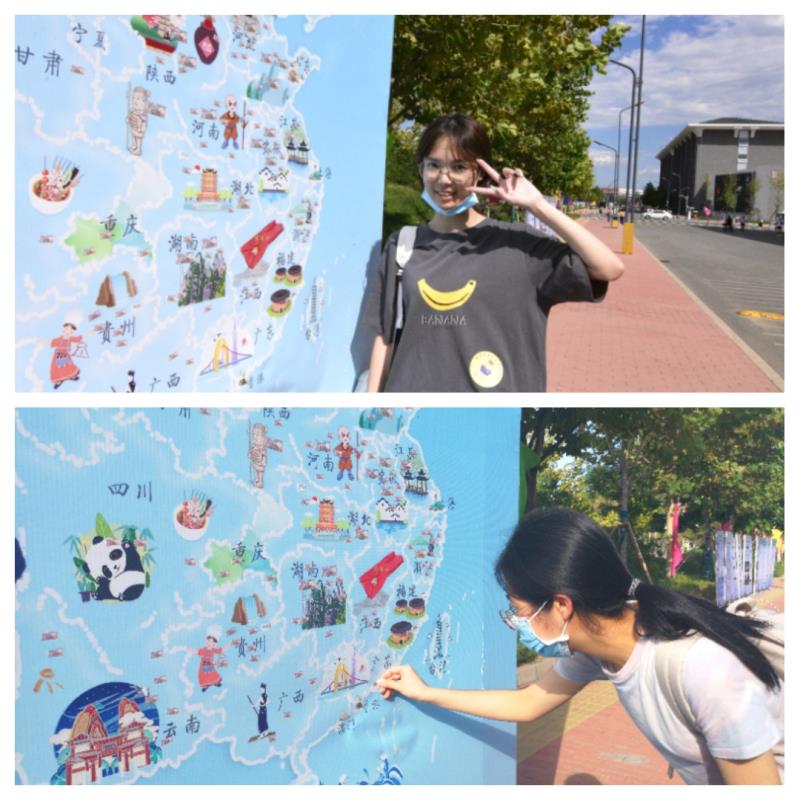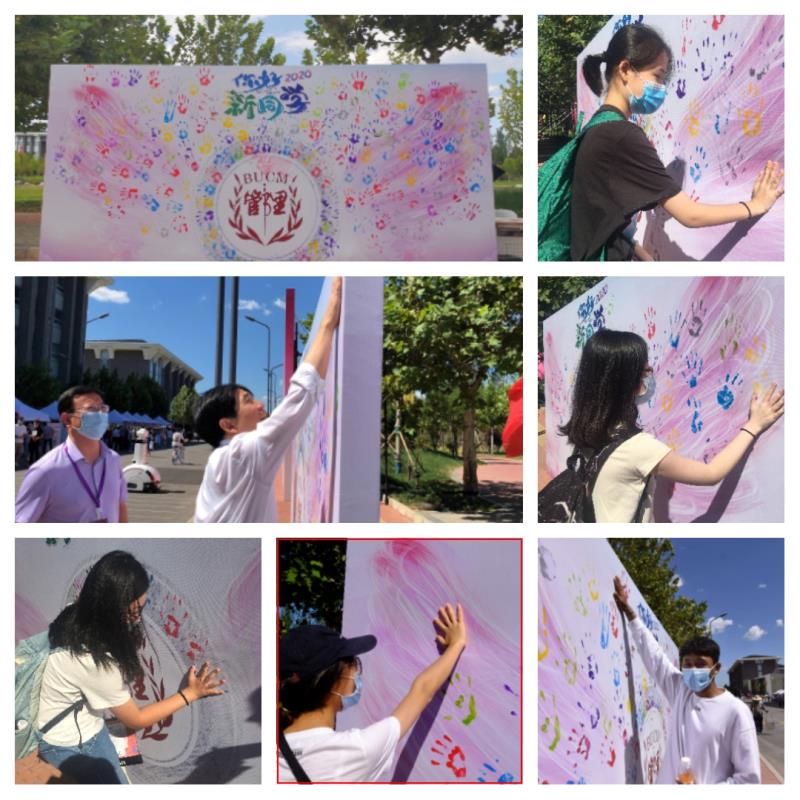 在管理学院报到点对面,院团委、学生会布置了两张展板。第一张展板展现的,是延伸出一对水彩渲染的翅膀管理学院院徽,新生们用自己沾有五彩颜色的掌印,深深地印在展开的双翅上,以此表达搏击学海风浪,展翅房费青春的决心。另一张则是一张绘有全国各省市代表性标志的中国地图,学子们来自五湖四海,怀抱着同一个梦想相会在管院这个大家庭,成为彼此生命中的缘分。在中国大地的版图前,杏仁儿们齐聚北京、回望家乡,将自己的名字粘贴在自己家乡的位置上,这是一个新的原点,从这个点开始,新同学么将谱写一段属于自己、属于管理学院,也属于北京中医药大学的崭新故事。