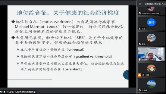 2022年9月22日管理学院博约讲坛邀请中国人民大学社会与人口学院教授、社会学理论与方法研究中心研究员齐亚强教授作主题为“地位综合征——影响健康的社会因素”的报告,本次讲坛采用腾讯会议的形式线上举办,由管理学院李瑞锋院长主持,共130余名师生线上参与并交流互动。