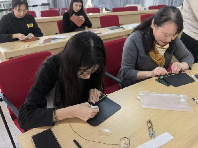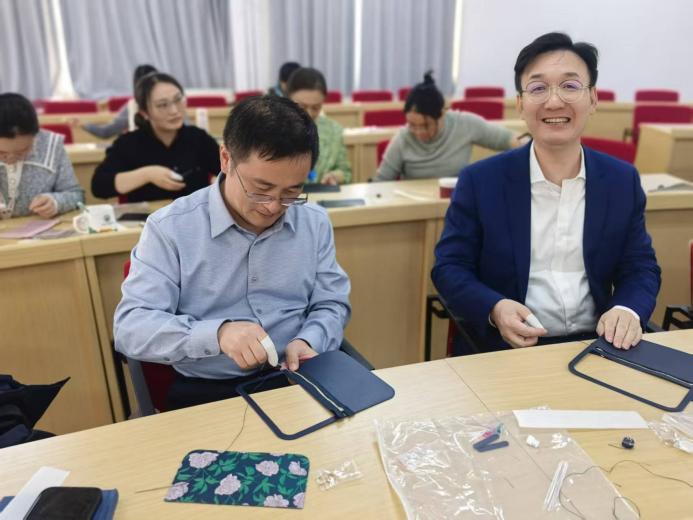 在随后的手工实践环节,老师们在专业教师的指导下,亲手体验皮具缝制的全过程。从学习“双针法”缝制技巧,到处理皮料边缘,再到将精美的宋锦面料贴合于皮具表面,每一步都凝聚着专注与匠心。大家一边交流缝制心得,一边将传统纹样与现代皮艺相融合,逐步完成了一件件独具个性的非遗皮具包。
