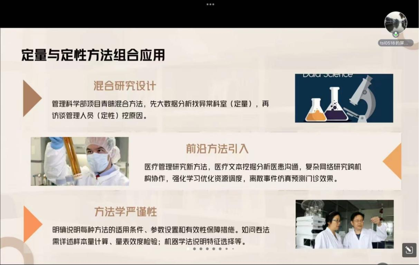 汤少梁教授围绕国家自然科学基金申报中的精准选题、技术路线设计、研究方法选择与创新点提炼等关键环节进行了详细介绍,结合自身丰富的申请经验,对每个环节的常见问题、核心要点与提升策略进行了深入剖析,强调国自然的申报当紧跟战略,目标凝练,环环相扣,层层递进,交叉融通,尤其是管理科学研究,要充分利用人工智能等信息化技术和多源数据,同时不能忽略实地调研的重要性。