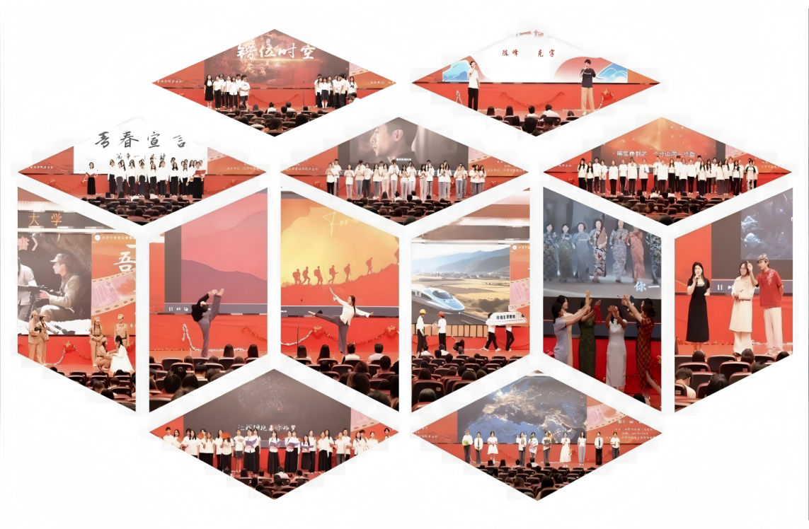 “觉醒·青春之光”篇章中,莘莘学子以炽热之心激情澎湃地诠释“青年”一词,从百年前的思想风暴中汲取进取精神,深情致敬不朽的巾帼力量,奋力点燃文明传承的熊熊薪火!“烽火·民族存亡”篇章以团结抗日、致敬先烈为背景,撼人心魄地歌颂中华民族不屈的精神,让中华儿女浴血奋战、捍卫家园的铁血荣光,穿越时空,重燃于心!“铁血·英雄之歌”篇章是为铭记英雄们建立的不朽功勋,震撼心灵的情景剧诠释着理想信仰的伟力;孤勇而坚韧的独舞,无声却磅礴地诉说着生命的顽强与韧性,英雄的赞歌在此刻回响!最后,春风拂过神州大地,奋进中国阔步向前,在“腾飞·时代之梦”篇章中,青年们以磅礴的合声汇聚成时代强音,振奋的播报传递着“十四五”的辉煌成就,让百年前的觉醒精神在新时代绽放理论光芒,于时代浪潮里书写青春华章!