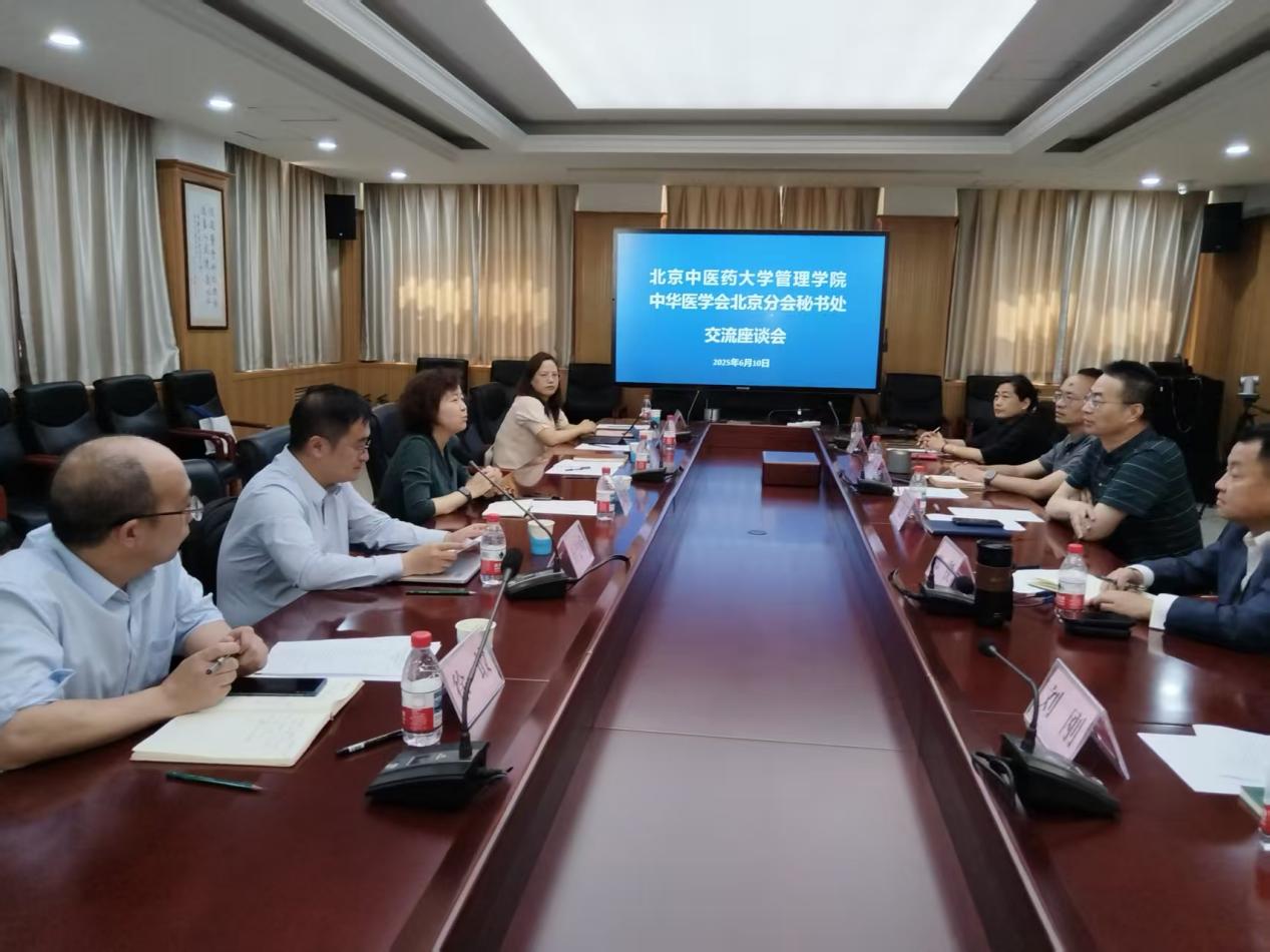2025年6月10日下午,管理学院党委书记李蔓荻率队赴中华医学会北京分会秘书处开展交流座谈。管理学院党委副院长石学峰、副书记周磊、大数据与人工智能教研室主任郭凤英、药事管理教研室主任徐敢及教学管理办公室张勇老师共同参与。座谈会由医学会秘书处书记兼秘书长王建东主持,副秘书长郑铁、朱伟,北京中西医结合学会秘书长刘刚、北京中医药学会秘书长杨娜及办公室副主任汪明慧等参会。双方围绕学生实习实践、就业及科研协作展开深度对话,旨在构建医教协同创新平台。