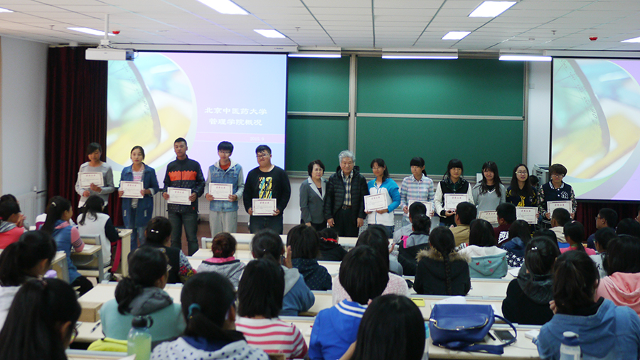 10月10日下午,在良乡校区崭新的庭院式教学楼中,管理学院首任院长姚高升、现任院长赵静、副院长王志伟,为2015级管理学院新生开讲第一堂专业导读课《相识管理学院》,王志伟副院长主持课程。开讲前,姚高升院长、赵静院长为新生军训优秀学员颁发奖状并合影。