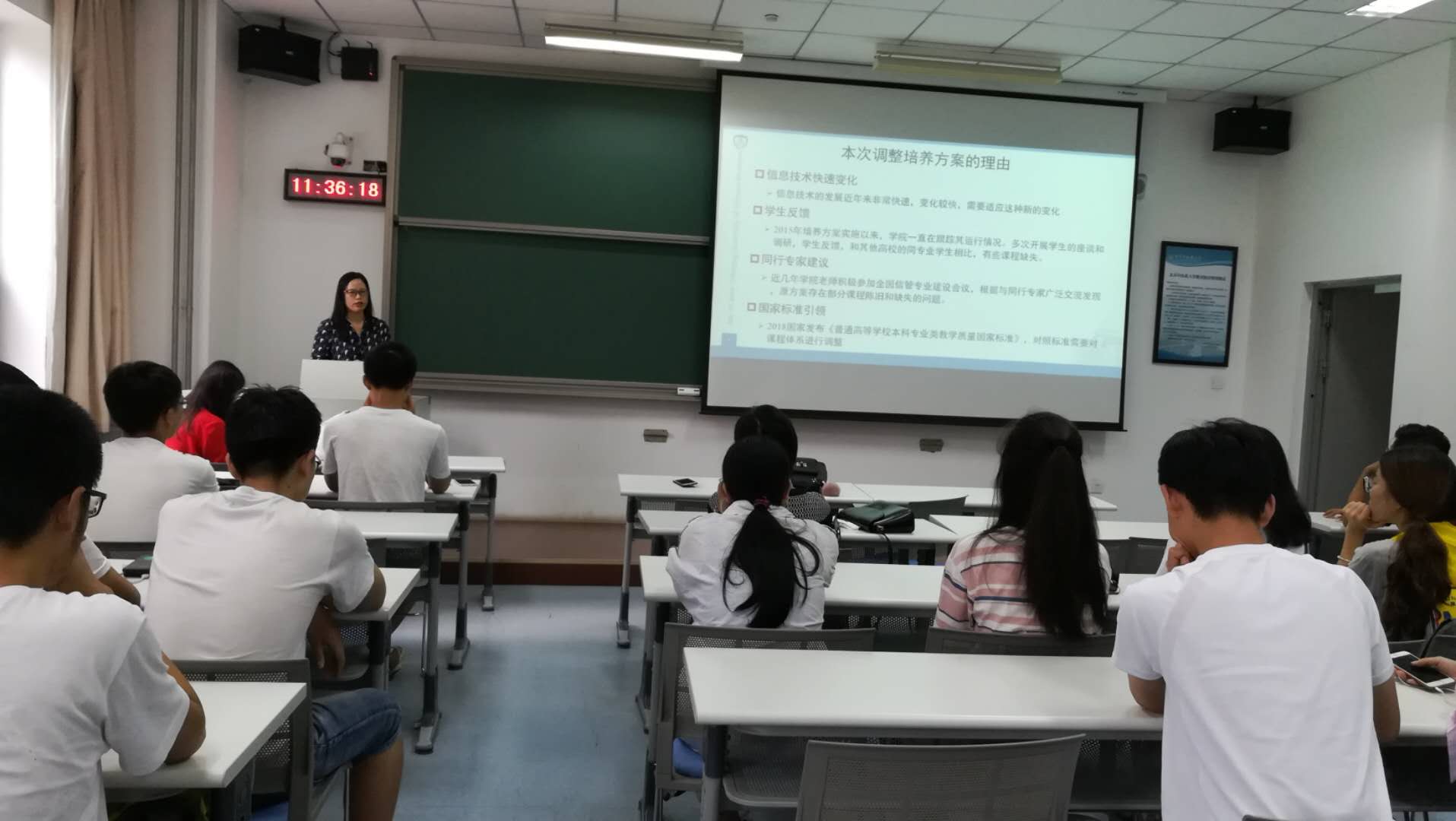 2018年7月16日,火热的期末考试在酷暑中结束了。然而,17信管班的同学们又迎来了新的挑战。此前,管理学院按照学校教改要求,对信管系的课程方案进行了调整、改革,并将在2018级新生入学后开始实施。与旧方案相比,新方案增加了高等数学等数学课程的学时,加强了Java程序设计的学习,增添了信息资源管理等方面的课程。新方案减少了医学课程的学时,增强了计算机技术方面的专业课程,使整个课程体系更适应信管方向的就业需求和考研深造。如何面对这一变化,是否采用新的培养方案,关系着每一位同学未来的学业发展。为此,小学期上课期间,17信管班在班主任唐燕老师的主持下,召开了班会,对是否也采用新的课程方案进行了讨论。为了使大家对新方案了解得更加清晰,信管系的郭凤英老师和学院教办的王鸿蕴、张勇老师到会进行了指导和讲解,很多同学甚至请假出席了会议。班会上,郭凤英老师首先为同学们介绍了课程方案改革的背景,和新旧方案的比较,之后,在唐燕、王鸿蕴等老师的指导和帮助下,同学们分组针对新老方案的利弊展开了激烈的讨论。