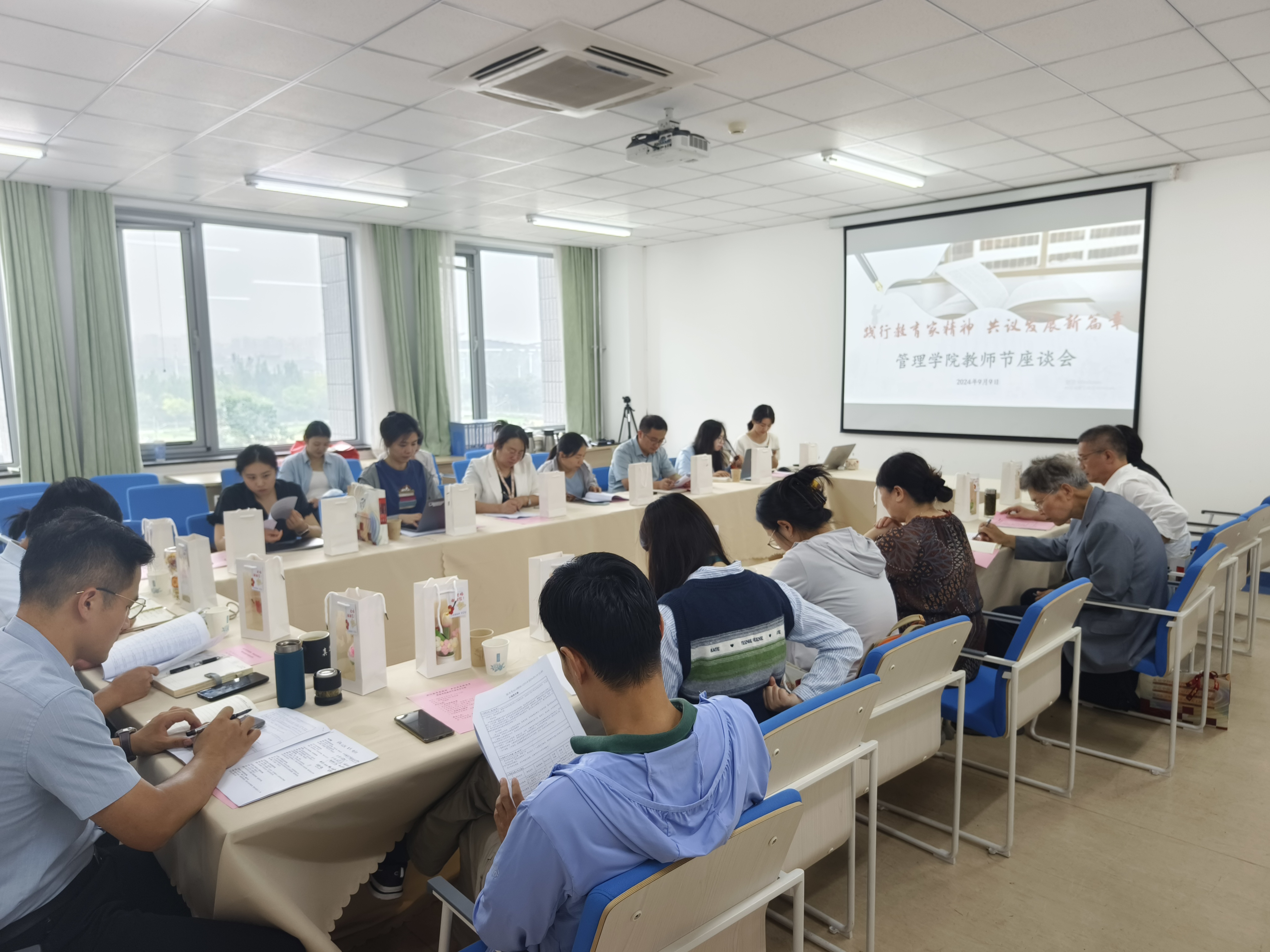 在第40个教师节来临之际,为弘扬教育家精神,共谋发展新篇章,管理学院于9月9日召开教师代表座谈会,荣休教师代表、学院领导、教研室主任、教师代表和行政人员代表参加座谈会。会议由王慧副院长主持。