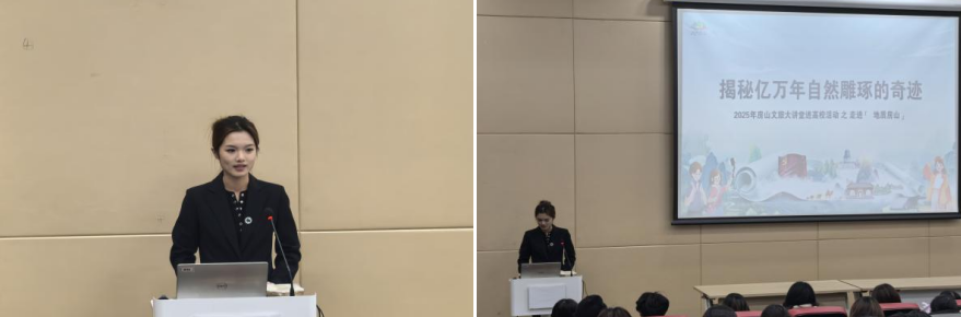 2025年11月27日,由房山区文旅局、北京中医药大学校团委主办,管理学院承办的“房山文旅大讲堂进高校”活动在管理学院一楼报告厅成功举办。本次活动以“揭秘亿万年自然雕琢的奇迹”为主题,特邀中国房山世界地质公园博物馆金牌讲解员、房山区文旅宣讲团讲师刘双琦老师,采用线上线下相结合的方式,为同学们带来了一场走进“地质房山”的精彩讲座,带领大家共同解锁房山这座“地质宝库”的奥秘。