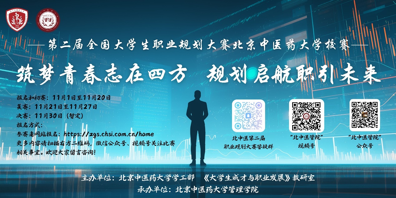 由我校学工部、《大学生成才与职业发展》教研室主办,管理学院承办的第二届全国大学生职业规划大赛北京中医药大学校赛已于2024年11月初开启报名渠道。为进一步引导广大学生以科学严谨的态度和方法规划职业生涯,搭建起学习交流平台,共同探索职业发展的广阔前景,并帮助学生参赛做好准备,2024年11月7日18:00,中国·开云在线上开展了第二届全国大学生职业规划大赛北京中医药大学校赛赛前培训,通过企业微信直播平台面向全体在校生开放,400余人次参与了观看。本次培训邀请了大赛评审经验丰富的招生与就业处的徐博函老师,为参赛同学深入解读比赛规则并提供专业指导。